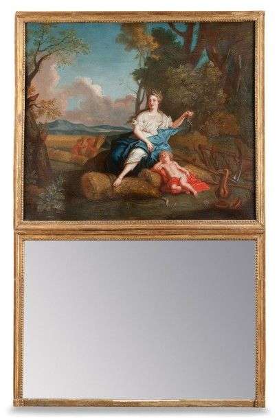 Trumeau composé d'une huile-sur-toile représentant Cérès assise sur des gerbes, un putto endormi à ses pieds, surmontant un miroir à encadrement de baguettes à rangs de perles. Fin du XVIIIème siècle. H: 152 - L: 95 cm. Restauration et accident.