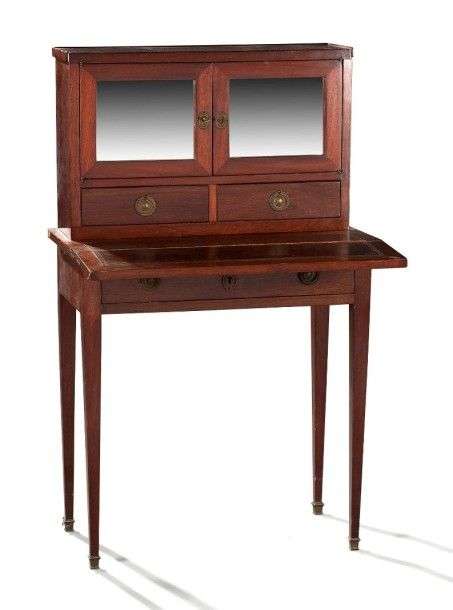 Bonheur-du-jour en acajou et placage d'acajou| de forme rectangulaire, le gradin ouvre par deux petits vantaux foncés de glace et deux tiroirs| l'abattant déployé gainé de cuir vert| un large tiroir en ceinture| pieds gaines. Vers 1800. H: 113 - L: 70,5 - P: 41 cm. Accidents et manques.