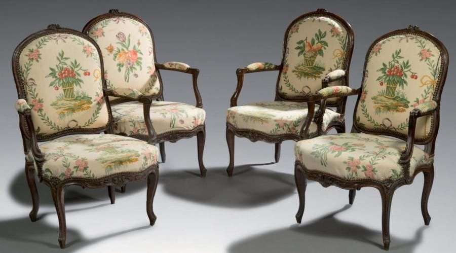 Suite de quatre fauteuils en noyer mouluré et sculpté de fleurettes et feu