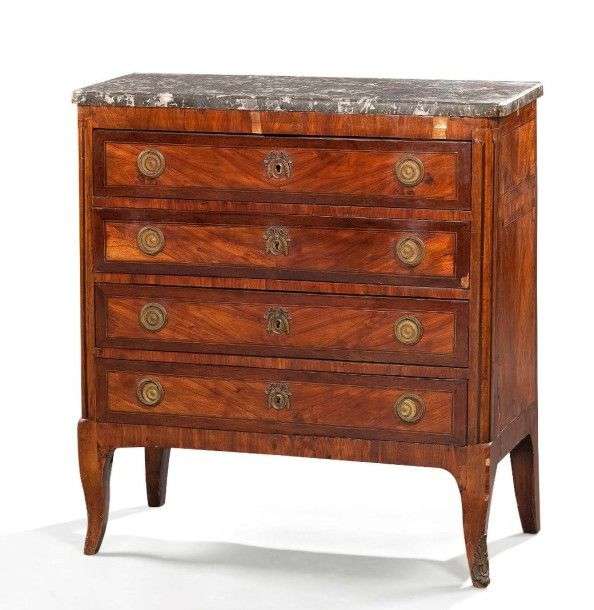 Commode en marqueterie ouvrant par quatre tiroirs Plateau de marbre gris Epoque Transition (manques au placage)