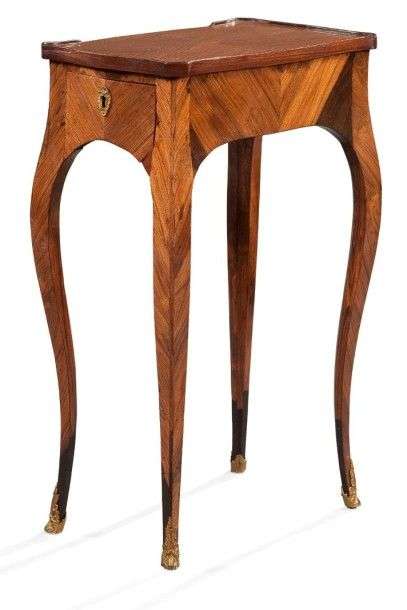 Petite table de salon marquetée en quartefeuilles ou frisage de bois de violette| de forme contournée, elle ouvre par un tiroir latéral et repose sur des pieds cambrés à facettes. Epoque Louis XV. H: 70 - L: 44 - P: 27 cm. Eestauration.