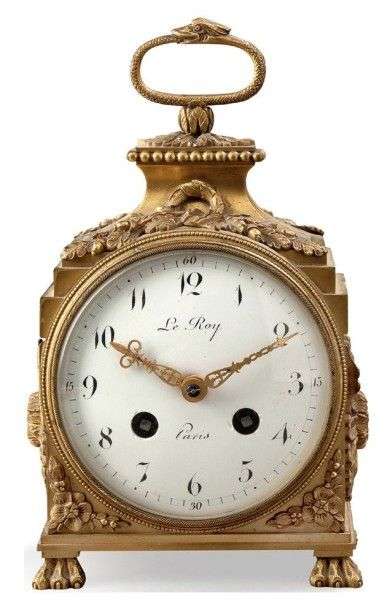 Pendule dite «d'officier» en bronze ciselé et doré| la bélière en forme de serpent repose sur un entablement à rang de perles à décor de couronne de laurier et feuilles de chêne| les faces latérales à rosaces| pieds en griffes de lion| le cadran émaillé, signé «Le Roy à Paris», indique les heures en chiffres romains et les minutes par tranches de quinze. Style Louis XVI. H: 23,5 - L: 13 - P: 9 cm. Égrenures au trou de remontage droit.