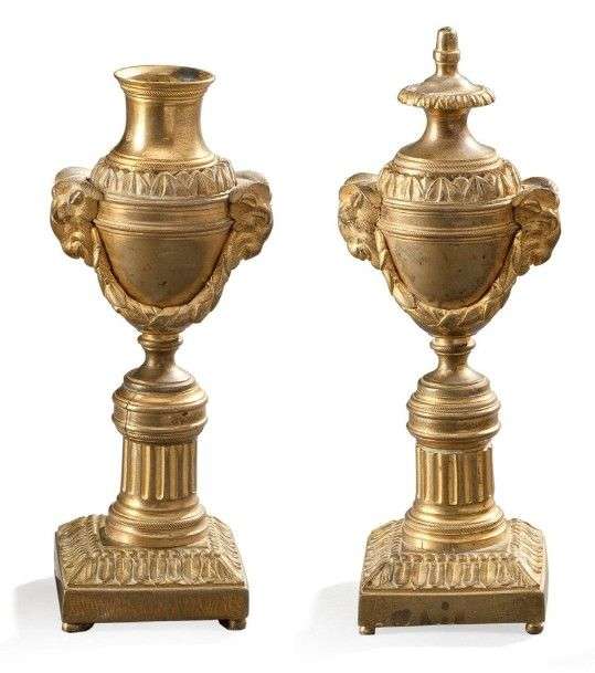 Paire de bougeoirs cassolettes en bronze ciselé et doré à décor de têtes de bélier retenant des guirlandes de laurier sur des colonnes cannelées| bases quadrangulaires à rangs de perles et raies de c?ur. Style Louis XVI. H: 22,5 cm.