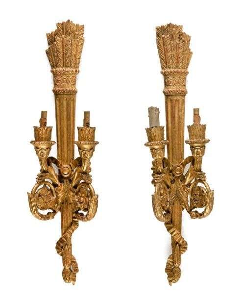 Paire d'appliques à deux lumières en bois sculpté et doré| les fûts cannelés ou rudentés en forme de carquois à décor de frises d'entrelacs se terminent par des empennages de flèches| au centre, un ruban auquel est attachée une draperie d'où s'échappent les bras de lumières en enroulements centrés de fleurettes. XIXème siècle. H: 67 - L: 17,5 cm. Légers éclats| montés à l'électricité.