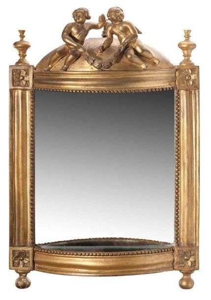 Curieuse petite étagère en bois sculpté et doré à fond de glace| à l'amortissement, des angelots tenant une guirlande appuyés sur un dôme| montants moulurés à écoinçons à rosaces. Style Louis XVI. H: 54 - L: 39 cm.