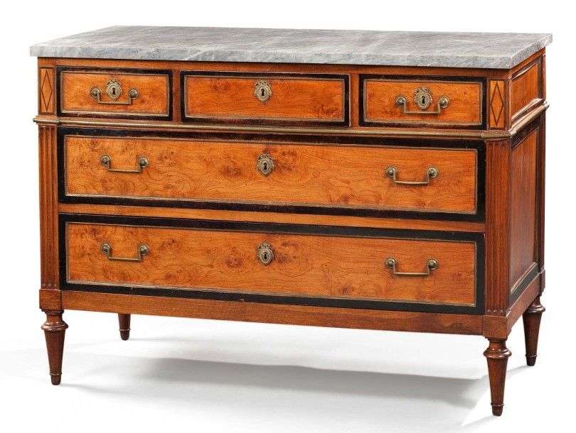 Commode en placage de frêne dans des encadrements en bois noirci souligné de carderons en laiton| de forme rectangulaire, elle ouvre par cinq tiroirs sur trois rangs avec traverses| montants à cannelures| pieds toupies. Travail provincial du début du XIXème siècle. Plateau de marbre gris Sainte-Anne. H: 92 - L: 126 - P: 60 cm. Manque et soulèvements au côté gauche.