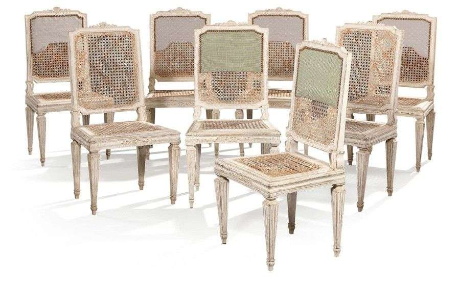 Suite de huit chaises à dossier plat en hêtre mouluré, sculpté et relaqué blanc| les dossiers sommés de coquilles d'où s'échappent des guirlandes de laurier| pieds quadrangulaires fuselés à cannelures. Travail provincial de la fin du XVIIIème siècle. Fonds de canne. H: 97,5 - L: 49 - P: 44 cm. Renforts| deux pieds à refixer.