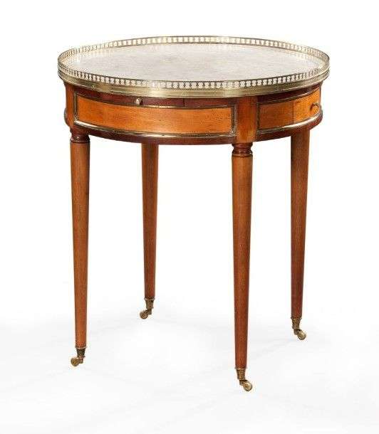 Table dite «bouillotte» en placage de citronnier dans des encadrements d'acajou| de forme circulaire, elle ouvre par deux tiroirs en opposition et deux tirettes latérales| pieds fuselés terminés par des roulettes| plateau de marbre blanc veiné gris encastré. Début du XIXème siècle. H: 75 - D: 65 cm. Quelques piqûres.