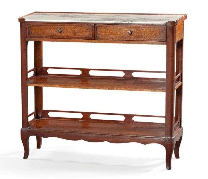 Etagère en acajou et placage d'acajou| elle ouvre par deux tiroirs en façade| montants arrondis réunis par deux tablettes| pieds cambrés| plateau de marbre blanc veiné gris. Vers 1900. H: 79,5 - L: 88 - P: 27,5 cm. Accident