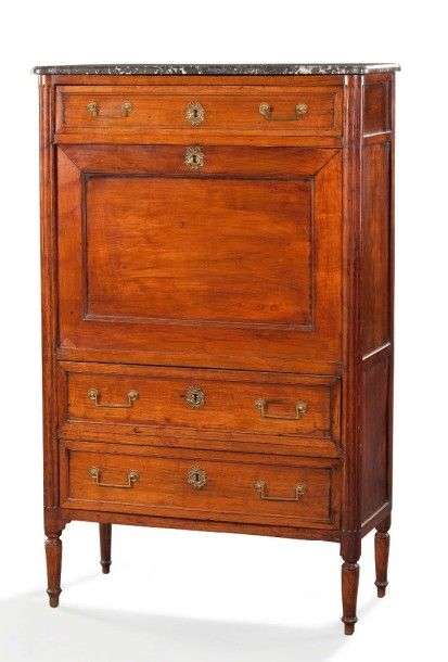 Secrétaire à abattant en merisier mouluré de forme rectangulaire, il ouvre par un abattant découvrant un serre-papier muni de six tiroirs, à la partie basse par deux larges tiroirs et un tiroir supérieur| montants arrondis à cannelures| pieds fuselés à bagues. Travail provincial vers 1800. Plateau de marbre gris Sainte-Anne. H: 142,5 - L: 88 - P: 38,5 cm. Accident à un pied.
