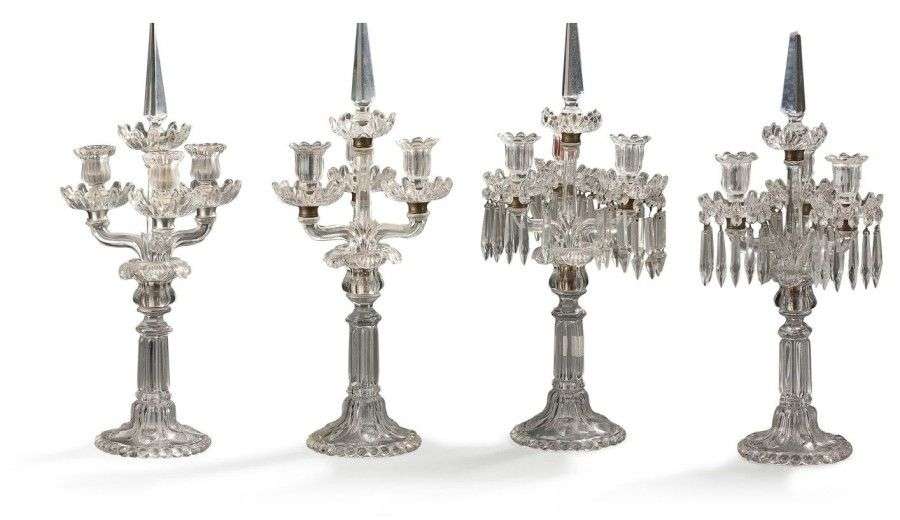 Deux paires de girandoles à trois lumières en verre moulé ou taillé surmontées de poignards| les fûts godronnés reposent sur des bases circulaires à rangs de perles. Deux d'entre eux rehaussés de mirzas (légères différences). H moyenne: 53 cm.