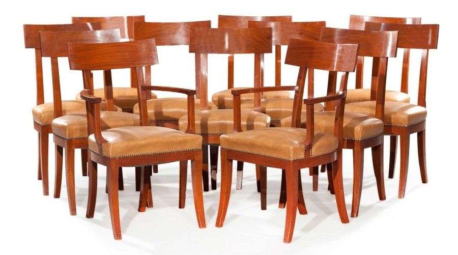 Mobilier de salle à manger en acajou composé de dix chaises et d'une paire de fauteuils| dossiers à bandeau| pieds sabres. Style Empire. Garniture à l'imitation du cuir havane. Dim. d'une chaise: H: 90 - L: 47 - P: 41 cm.