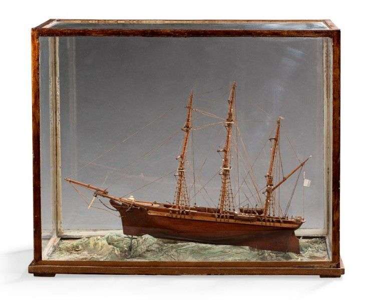 Maquette en bois, acier, os et cordelettes représentant un trois mâts à l'ancre. Sous vitrine. Dim. hors tout: H: 42 - L: 51,5 - P: 26 cm.