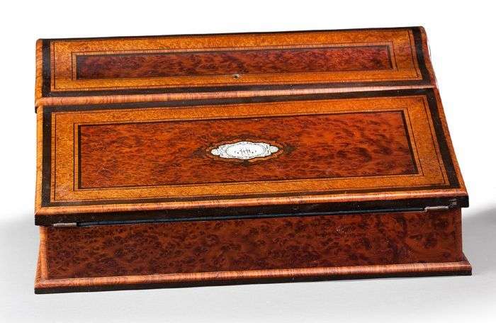Ecritoire marquetée en loupe de thuya dans des encadrements de loupe d'amboine soulignés de filets| il ouvre par deux abattants dont un dissimulant le serre-papier et l'autre formant écritoire. Sur l'abattant principal un cartouche en ivoire gravée porte un monogramme «NM». Epoque Napoléon III. H: 17 - L: 37 - P: 30 cm. (*)