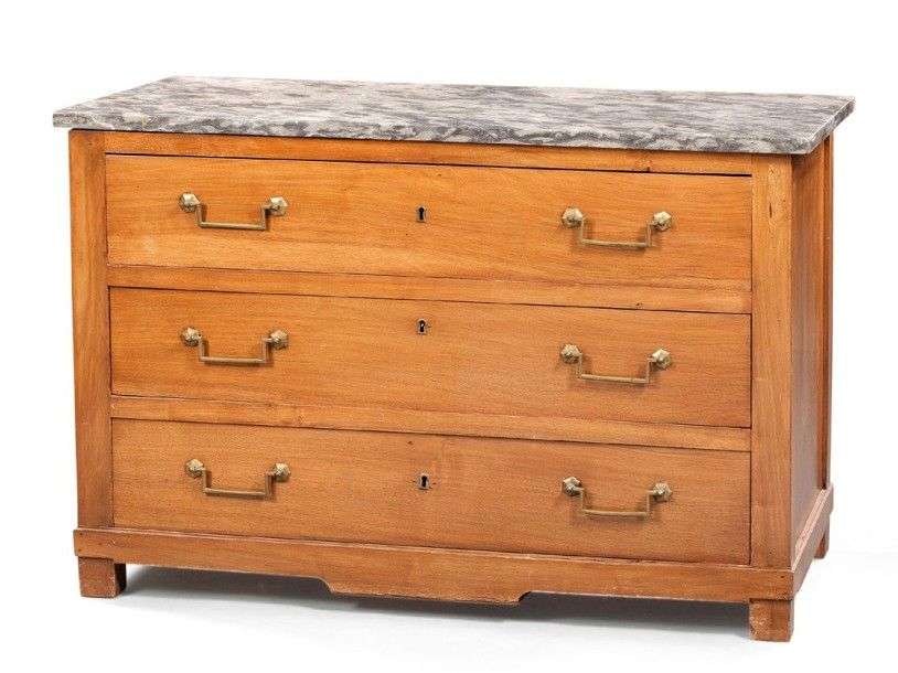 Commode en noyer naturel de forme rectangulaire, elle ouvre par trois larges tiroirs| poignées tombantes. Travail provincial du XIXème siècle. Plateau de marbre. H: 85 - L: 126 - P: 61 cm. (*)