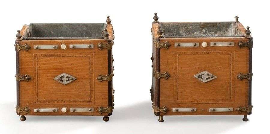 Paire de petites caisses à fleurs en acajou et placage d'acajou à décor de filets de bois de rose| ornementation de motifs fleurdelisés en métal| plaquettes, perles et losanges à fleurettes en nacre gravée| doublures en zinc. Vers 1900. H: 13,5 - L: 12 - P: 12 cm. Manques.