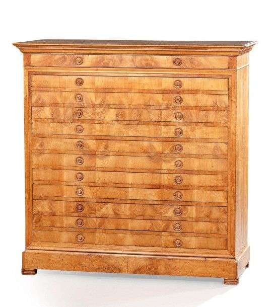 Curieux chiffonnier marqueté en bois fruitier mouluré| de forme rectangulaire, il ouvre par treize tiroirs avec traverses| montants, base et plateau moulurés| pieds quadrangulaires en motifs empilés. Première moitié du XIXème siècle (piqûres et fentes). H: 135,5 - L: 135 - P: 49,5 cm.