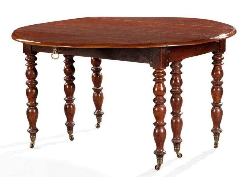 Table de salle à manger à plateau ovalisé à ouverture médiane en acajou| elle repose sur six pieds balustres à bagues terminés par des roulettes. Première moitié du XIXème siècle. On y joint une allonge moderne. H: 70,5 - L: 129 - P: 127 cm. Quelques légères griffures au plateau| un élément du système du piètement à refixer.
