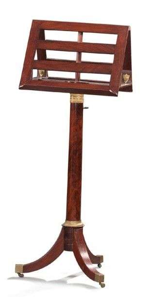 Lutrin en acajou et placage d'acajou| le porte-livres réglable en hauteur repose sur un fût à bagues en bronze moleté| pieds sabres à sabots munis de roulettes. Epoque Empire. H: 117 cm.