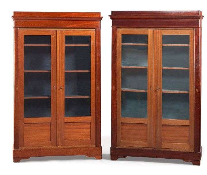 Paire de petites bibliothèques en acajou et placage d'acajou| corniches à doucine| basses pleines et pieds en consoles| de forme rectangulaire, elles ouvrent par deux portes partiellement vitrées. XIXème siècle. H: 156,5 - L: 91 - P: 30,5 cm. Cartonniers modifiés| légères différences