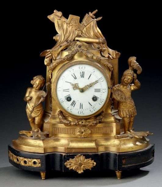 Pendule en bronze ciselé et doré, à l'amortissement un trophée d'armes à canon, drapeaux et fusil| de chaque côté du mouvement contenu dans une borne figure un jeune personnage, Cupidon et Mars symbolisant l'Amour et la Guerre| le cadran indique les heures en chiffres romains et les minutes en chiffres arabes par tranches de cinq. Epoque Louis XVI. Socle en bois teinté noir à frises d'entrelacs. H totale: 37 - L: 32 - P: 15,5 cm.