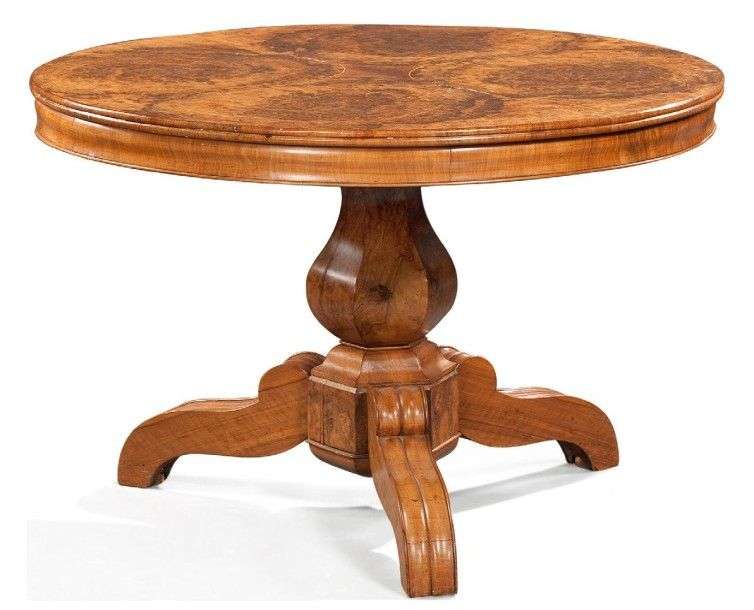 Guéridon circulaire le dessus plaqué en loupe de noyer, la ceinture moulurée| fût balustre| pieds en consoles moulurées. XIXème siècle. H: 74 - D: 112 cm. Fentes.(*)
