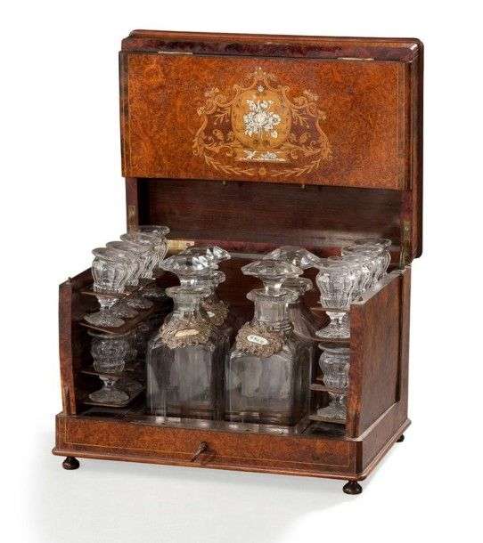 Cave à liqueur en placage de ronce à décor en marqueterie de bois clair et d'ivoire d'un médaillon orné en son centre d'un bouquet. Elle comprend quatre flacons et seize petits verres en cristal taillé Accidents Epoque Napoléon III H: 22 - L: 33 - P: 24,5 cm
