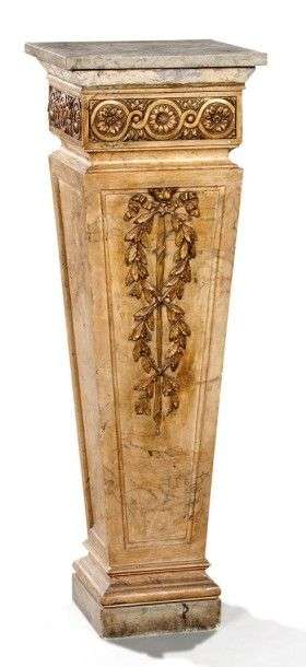 Gaine fuselée en plâtre peint à l'imitation du marbre| base moulurée et chapiteau décoré d'une frise appliquée en stuc dorée à motifs d'entrelacs. Style du XVIIIème siècle. H: 111,5 cm. Accidents et manques