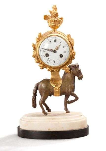 Pendulette en bronze ciselé, doré ou patiné| le mouvement supporté par un cheval et surmonté d'un vase rocaille fleuri| base en marbre blanc moulurée et contre-socle de marbre noir. Le cadran indique les heures en chiffres romains et les minutes en chiffres arabes par tranches de cinq. Style du XVIIIème siècle. H: 29 cm. Accidents à l'émail du cadran. (*)