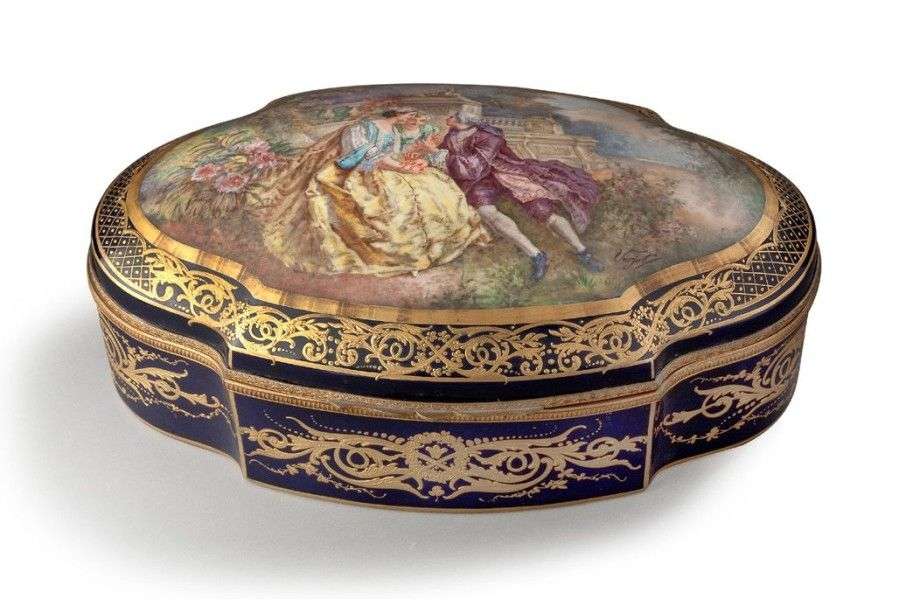 Importante boite en porcelaine à fond gros bleu et décor or de croisillons, rinceaux feuillagés et branchages fleuris. Elle est ornée sur le couvercle d'une scène galante signée Verdot. Vers 1900 H: 15 - L: 41 - P: 26 cm