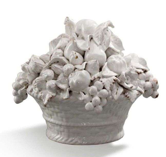Corbeille vannerie de fleurs et fruits en terre cuite émaillée. Italie, XX
