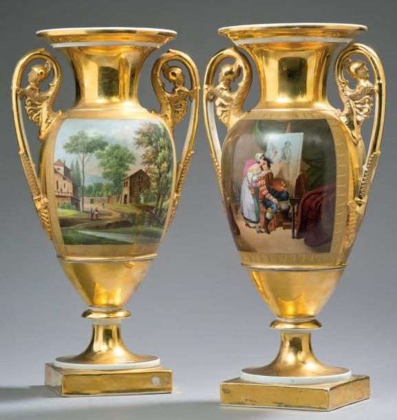 Paire de vases ovoïdes, en porcelaine à fond doré à décor en opposition, de paysages lacustres ou de perspectives animées de personnages, sur les autres faces des scènes galantes animées de personnages (l'atelier de musique ou l'atelier de peinture). Bases à piédouche. Anses ajourées à tête de guerrier (une recollée) Epoque Empire H: 40 - L: 21,5 cm