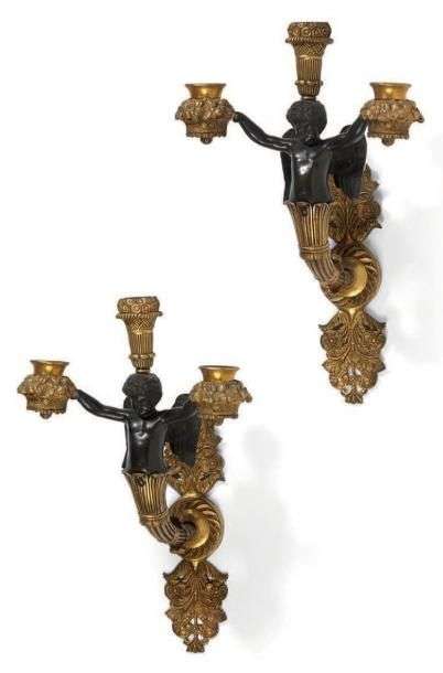 Paire d'appliques à trois lumières en bronze ciselé, doré ou patiné, les fûts représentent des angelots soutenant les bobèches en forme de corbeilles de fleurs, ces-derniers émergeant d'une corne à faisceaux| platines à motifs végétaux repercés. Style Restauration. H: 32 - L: 20.