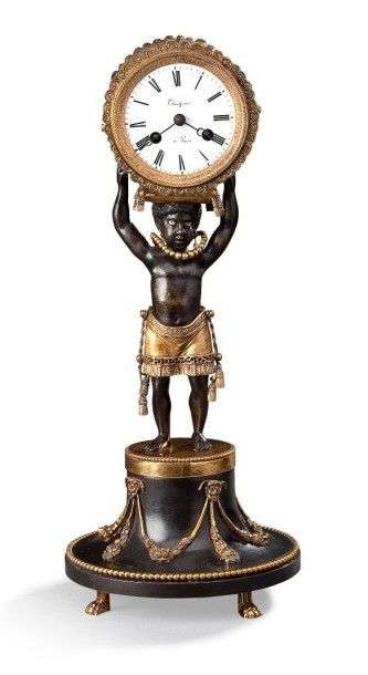 Pendule en bronze ciselé, doré ou patiné, elle représente un négrillon vêtu d'un pagne à franges portant, appuyé sur un coussin, un tambour simulant la canne à sucre qui renferme le mouvement| base évasée à rangs de perles et guirlandes de fruits à têtes de satyre| petits pieds griffes. Le cadran signé «Thonissen à Paris» indique les heures en chiffres romains et les graduations des minutes. Ancien travail de style Directoire. H: 42,5 cm.