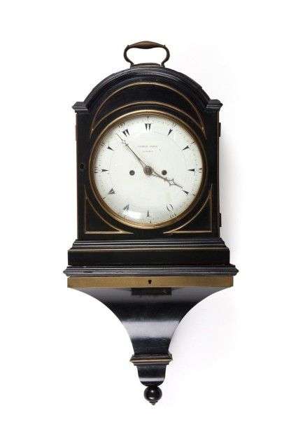 Pendule en bois noirci mouluré le mouvement à sonnerie à la demande signé «George Prior London» ainsi que le cadran| décor de carderons en bronze. Angleterre, XVIIIème siècle. Elle est présentée sur un cul-de-lampe se terminant en sphère. H: 66 cm. modification et fentes.