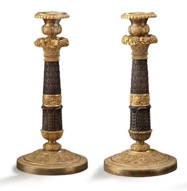 Paire de bougeoirs en bronze ciselé, patiné ou doré| binets à godrons| bobèches à palmettes reposant sur des corbeilles de fleurs et de fruits| fûts à feuilles de laurier| bases circulaires à palmettes et pampres sur fonds amatis. Epoque Restauration. H: 30 cm.