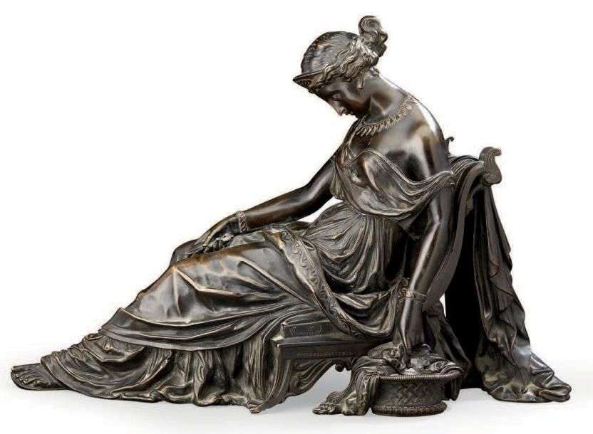 Statuette en bronze ciselé et patiné représentant une jeune Grecque assoupie sur son ouvrage. Signée: «Trouillard» et «Butte Fils Editeurs». Fin du XIXème siècle. H: 28 - L: 43 cm.