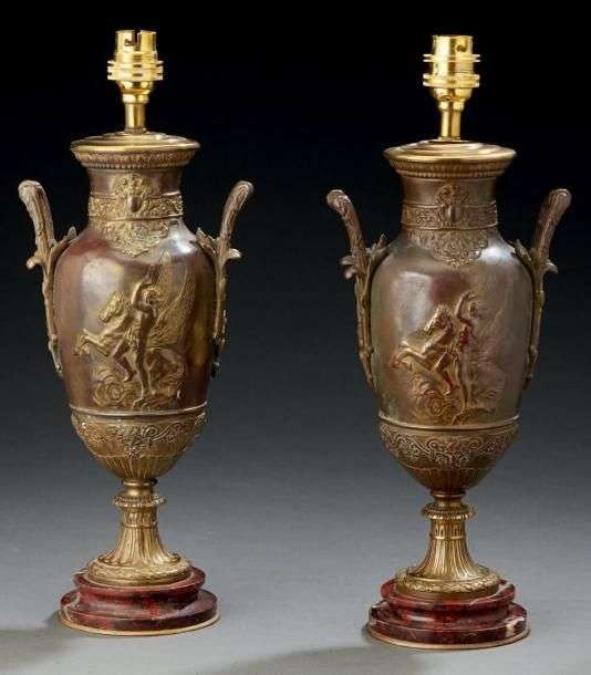 Paire de vases en bronze ciselé, doré ou patiné, les cols à rangs de perles, les panses à bas-reliefs représentant Pégase| anses ajourées feuillagées| piédouches à cannelures| bases circulaires en marbre rouge griotte. Signée Léon Boucher XIXème siècle. H: 29 - D: 14 cm. Montés en lampe.