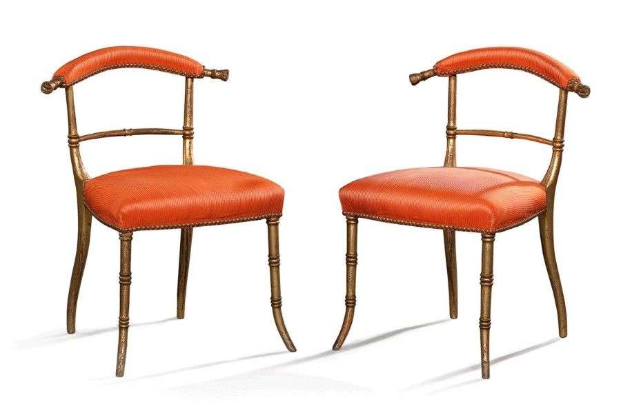 Paire de chaises basses en bois sculpté et doré| les dossiers ajourés à montants sinueux réunis par une baguette| pieds mouvementés imitant les bambous à l'avant. Seconde moitié du XIXe siècle (usure à la dorure| renforts possibles sous la garniture). Garniture en tissu saumon à bandes alternées. H: 69,5 - L: 43,5 - P: 48,5 cm.