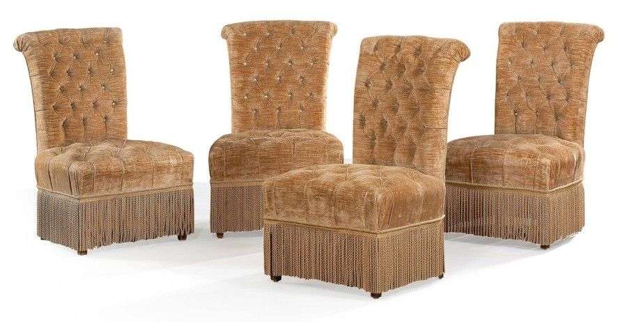 Suite de quatre chaises en velours chamois capitonné. H: 84 - L: 53 - P: 60 cm. On y joint un fauteuil «crapaud» en tissu crème.