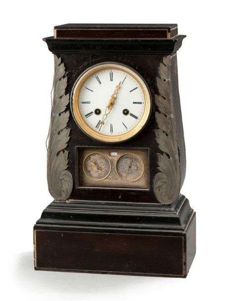 Curieuse pendule dite «borne» en bois noirci| les montants avants souligné