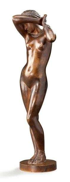 Belle statuette en bronze ciselé à patine mordorée représentant une Vénus pudique, le visage dans le creux de son bras| elle porte un collier et un bracelet et est chaussée de sandales. Base circulaire signée «Falguière» et «Goupil et Cie éditeurs», numérotée 59. H: 38 cm.