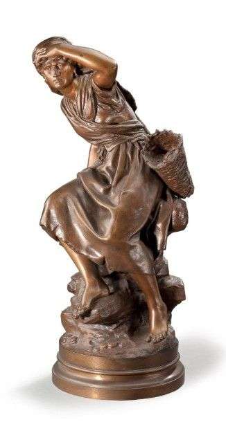 Groupe en bronze ciselé et patiné représentant une pêcheuse de moules| celle-ci assise sur un rocher regarde à l'horizon. Signée «Mathurin Moreau hors concours». Fonte d'édition ancienne. Sur une base tournante. H: 60 cm.