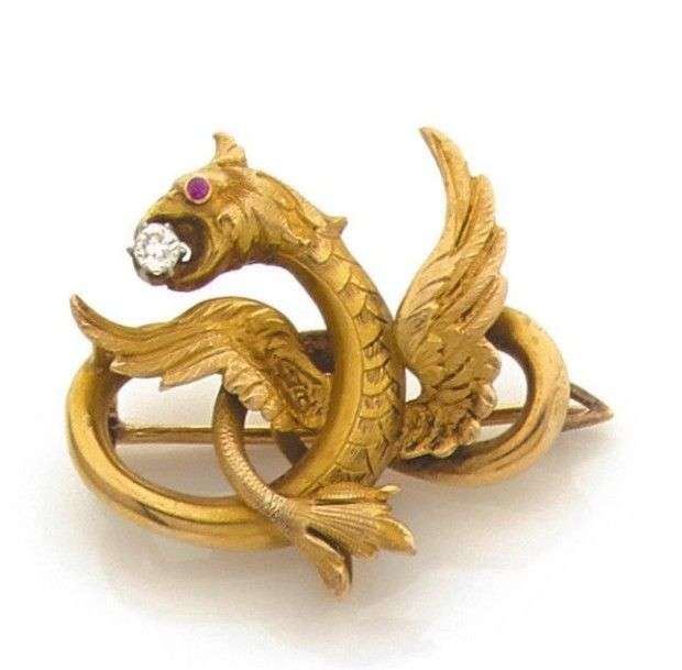 Petite broche "chimère" en or jaune ciselé 18k rehaussée d'un diamant de taille ancienne et d'un petit rubis. Epoque XIXème. Poids brut: 7.7gr A diamond, ruby and yellow gold brooch.