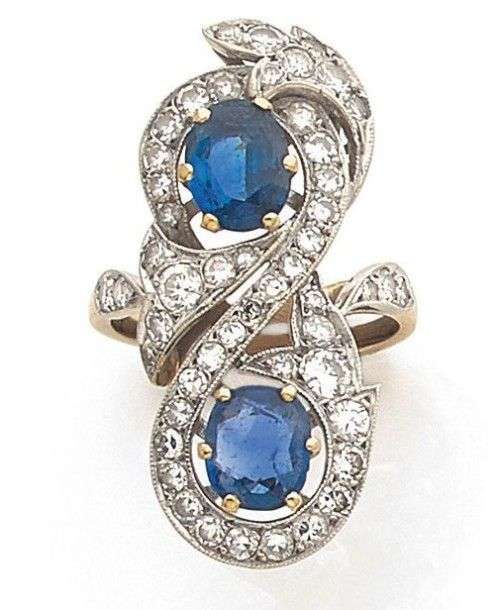Importante bague en or jaune et gris 18k sertie de deux saphirs de forme o