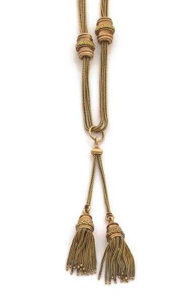Collier en or 18k composé d'une chaîne de montre ornée de coulants et de pompons en or rose rehaussés d'une couronne de laurier en or jaune. Epoque Napoléon III. Poids brut: 20 gr. A pink and yellow gold necklace.