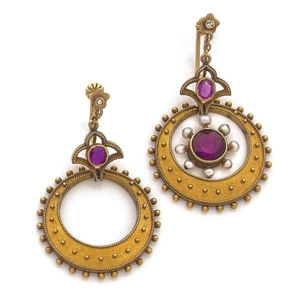 Paire de pendants d'oreilles en or jaune 18k composée de motifs circulaires retenant au centre une pampille sertie d'une pierre rose. Manque un motif au centre - Poids brut: 10.9gr A pink stone and yellow gold pair of earrings.