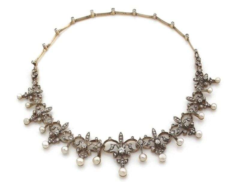 Collier en or jaune 18k et argent composé de fleurons sertis de diamants de taille ancienne et taillés en rose soulignés de perles fines. Pouvant se porter en diadème - sans les armatures. Epoque XIXème. Long: 21 cm - Poids brut: 38.2 gr A diamond, fine supposed pearl, silver and yellow gold necklace/tiara.