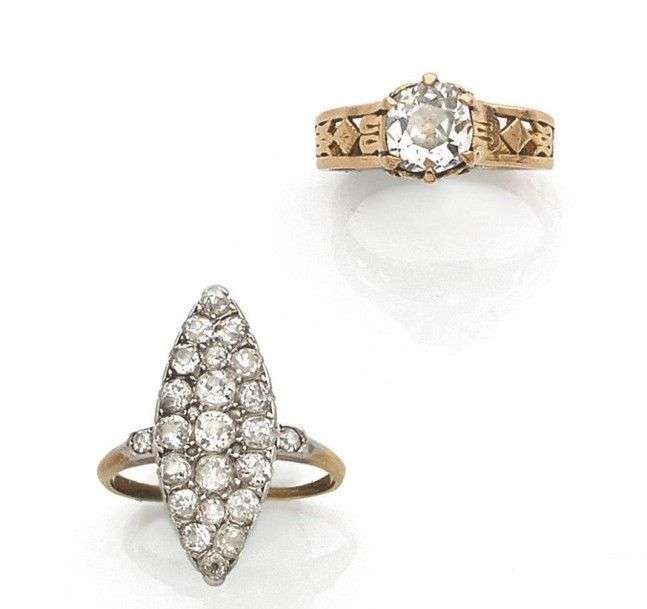 Ensemble composé de deux bagues en or jaune 18k| l'une sertie d'un diamant taille ancienne, l'autre d'un motif de forme navette pavé de diamants de taille ancienne. Tour de doigt: 51 et 53 - Poids brut: 6.74gr Two diamond and yellow gold rings.