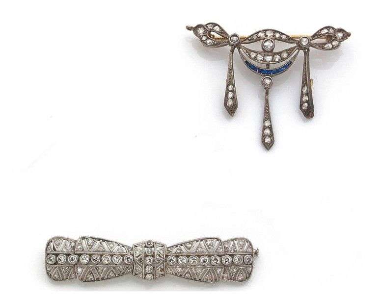 Ensemble composé d'une broche "noeud" en platine et or gris 18k ajouré et sertie de diamants huit - huit et une broche "draperie" en or jaune 18k et argent sertie de diamants taillés en rose soulignée d'une ligne de saphirs calibrés. Long: 5.3 cm / 4 cm - Poids brut: 13.5gr A diamond, platinium and white gold brooch and a sapphire, diamond, silver and yellow gold brooch.
